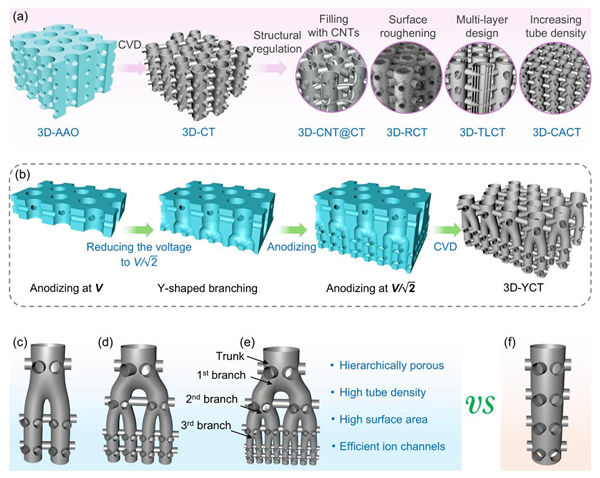 图1. Y分枝三维互连多孔阳极氧化铝模板(3D-Y-AAO)和Y分枝三维互连碳管(3D-YCT)的结构和制备过程示意图。