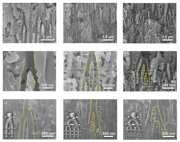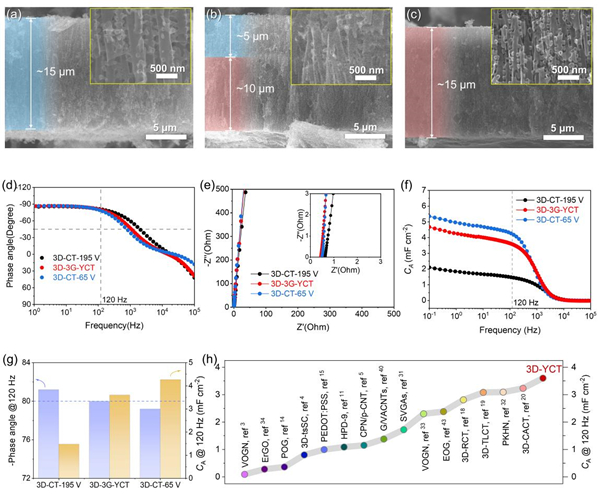 在上述工作基础上,团队成员陈干博士创制了由“Y”分枝碳管组成的多级孔道结构三维互连网格膜电极。通过合理调控含少量杂质铝片在阳极氧化过程中的氧化电压,获得了垂直孔按照“Y”形貌分枝的三维互连多孔阳极氧化铝模板,进而用模板孔限域诱导方法构建了Y分枝碳管三维互连网格膜电极(图1b)。这种网格电极的内部具有粗-细分级孔三维互连结构(图1c),其中的主干粗直径大孔能对电解液离子高速导流,而小直径分枝细孔兼具导流和高效吸附双重功能,显著降低了离子扩散能垒,在主干粗直径大孔和小直径分枝细孔的协同作用下,同时实现了快速频率响应与高比表面积电荷存储的双重突破。