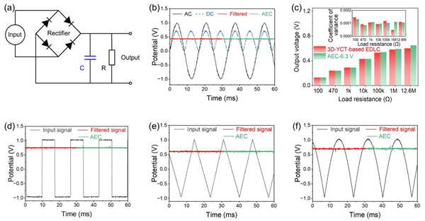 通过精准调控 “主干”和“分枝”孔的长度及比例(图1,2),新型电极在120 Hz下相位角为-80°时的面积比电容高达3.6 mF cm-2,远高于国际上已报道的所有三明治构型滤波超级电容器(图3)。与商用铝电解滤波电容器相比,这种新型滤波超级电容器具有明显的体积优势,对高精尖电子设备与器件的小型化具有极其重要的意义。系列实验研究表明,以该新型电极构筑的器件作为滤波电容器,可以将方波、三角波以及噪声信号等高效平滑为稳定的直流输出(图4)。
