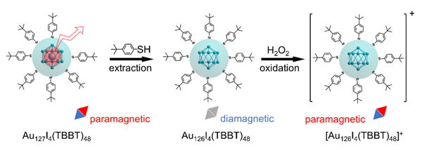 由于固有的热力学不稳定性,具有开壳层电子结构的顺磁性金纳米团簇长期以来在合成上面临重要挑战。针对这一问题,研究团队创新性地提出硫醇-碘离子混合配体保护策略,成功构筑了结构明确的多壳层顺磁性Au127纳米团簇。在维持价态稳定的基础上,精确移除单个中心金原子,实施了Au127纳米团簇的“摘心术”,从而对团簇磁学特性进行了定向调控。