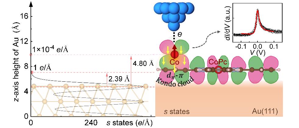 自旋电子学由于其在未来信息技术中的巨大应用潜力引起了研究者们的广泛关注。但是,如何构建具有稳定自旋特性或者自旋磁序的磁性纳米结构以满足实际应用的需求,是自旋电子学未来发展面临的关键瓶颈。针对这一科学问题,研究人员在前期工作中,从分子工程角度出发,利用d-π强相互作用机制,已在一系列零维和二维体系(Nat. Commun. 2020, 11, 2566; Sci. China Chem. 2021, 64, 2212; Nano Lett. 2022, 22, 1573; J. Am. Chem. Soc. 2023, 145, 7869; Nano Lett. 2024, 11, 3462; Nano Lett. 2025, 25, 1480)中取得了一些进展。例如,在Au(111)表面上构建的Co-CoPc分子复合物,由于Co原子d轨道和CoPc分子的大π轨道之间形成的强相互作用,很好地规律化了Co原子的自旋态,使得形成的近藤单态不受其他外界环境的影响(Nat. Commun. 2020, 11, 2566)。尽管如此,当时仍认为体系中产生的近藤效应与传统上的形成机制一样,即由Au(111)衬底的巡游电子来屏蔽Co原子的自旋产生的。这种反直觉的现象,意味着CoPc分子的作用可能被低估了,促使着科研人员深入探究近藤效应的形成机理。